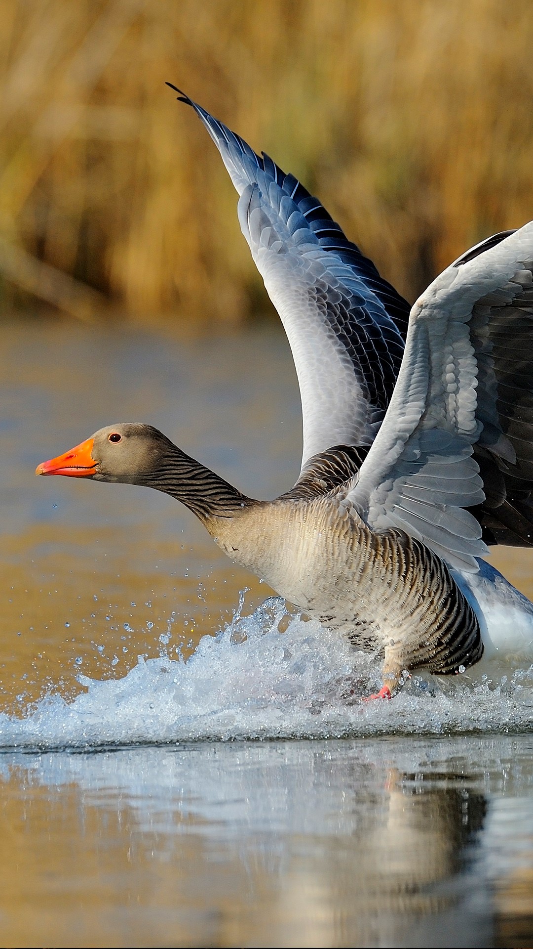 [윈도우 스마트폰 고해상도 바탕화면 잠금하면 모음] 1459. 독일 헤세 호수에 상륙한 그리야그 거위 / Greylag goose (Anser anser) landing on lake, Hesse, Germany