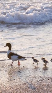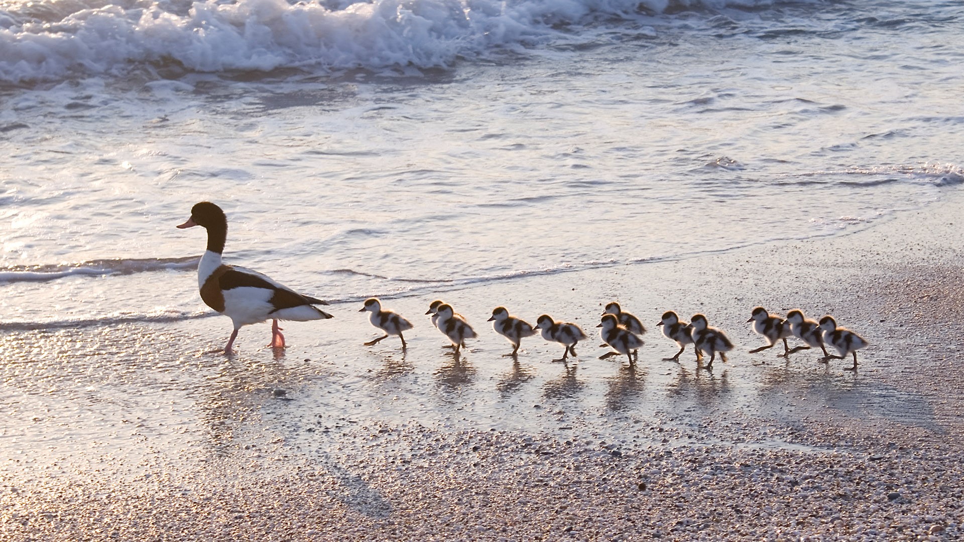 [윈도우 스마트폰 고해상도 바탕화면 잠금하면 모음] 2232. 프랑스 하이레스의 플라주 드 알마나르, 바다에서 첫 목욕을 하기 위해 어미를 따르는 오리 가족 / Family of ducks following mother for the firs..