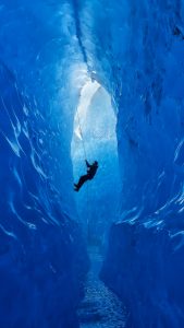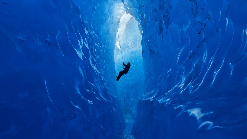 [윈도우 스마트폰 고해상도 바탕화면 잠금하면 모음] 224. 미국 알래스카 멘덴홀 빙하의 얼음동굴에 한 등산객이 뛰어들고 있다. / A climber rappels into an ice cave on the Mendenhall Glacier, Alaska, USA
