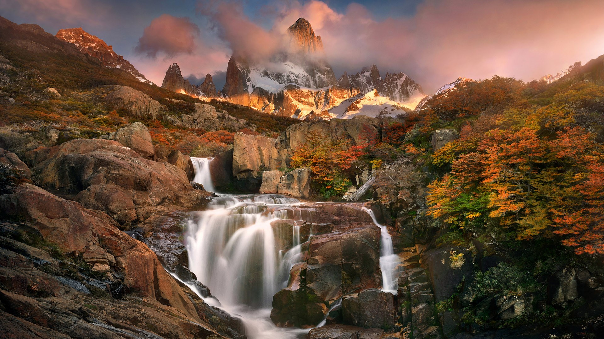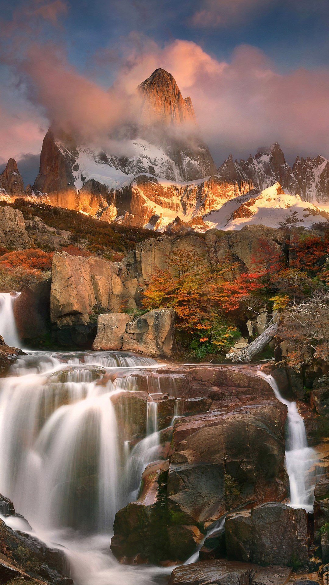 [윈도우 스마트폰 고해상도 바탕화면 잠금하면 모음] 2726. 아르헨티나 엘 샬텐, 로스 글라시아레스 국립공원, 피츠로이 산과 가을의 폭포 / Waterfall with Mount Fitz Roy in autumn, Los Glaciares National Park,..