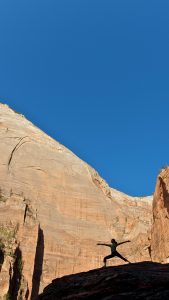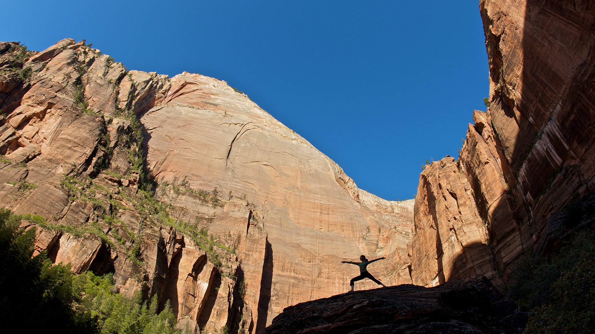[윈도우 스마트폰 고해상도 바탕화면 잠금하면 모음] 529. 바위에서 요가를 연습하는 젊은 여성은 미국 유타주 시온의 먼 절벽에 맞서 실루엣으로 보인다. / Young woman practicing yoga on a rock is silhou..